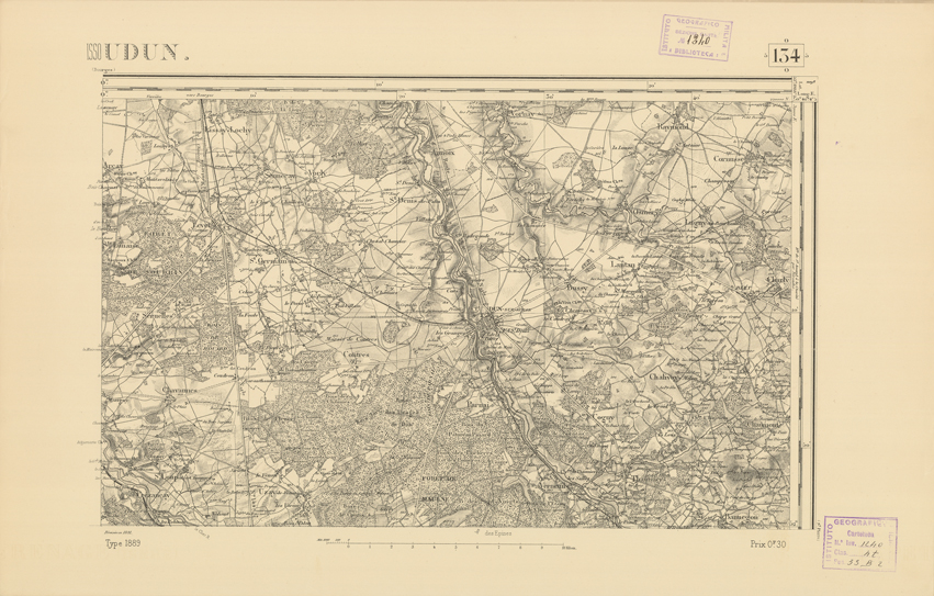 "Paris. Service Géographique de l'Armée, 1889. Ebbe origine dall'Edizione zincografica in quarti di foglio, stabilita dal 1879, per la carta detta de "L'Etat-Major". Infatti non rispondono più il sistema della riproduzione zincografica alle esigenze che la revisione dei fogli imponeva, per un inevitabile logoramento dei rami originali, fu proposta dapprima la correzione degli zinchi, ma questo, importando un lavoro lungo e gravoso, si adottò il procedimento galvanico. I rami galvanici ottenuti e corretti secondo questo sistema presero il nome di "édition type 1889". Allo scopo di facilitare l'incisione fu adoperata la suddivisione in quarti di foglio come per l'edizione zincografica. La revisione dei fogli di questo tipo non fu iniziata che nel 1893. Dal catalogo del S.G.A. risultano mancanti a questa edizione i dipartimenti della "Moselle", del "Bas-Rhin" e del "Haut-Rhin" per i quali non esiste che una edizione in fogli interi aggiornata nel 1901."