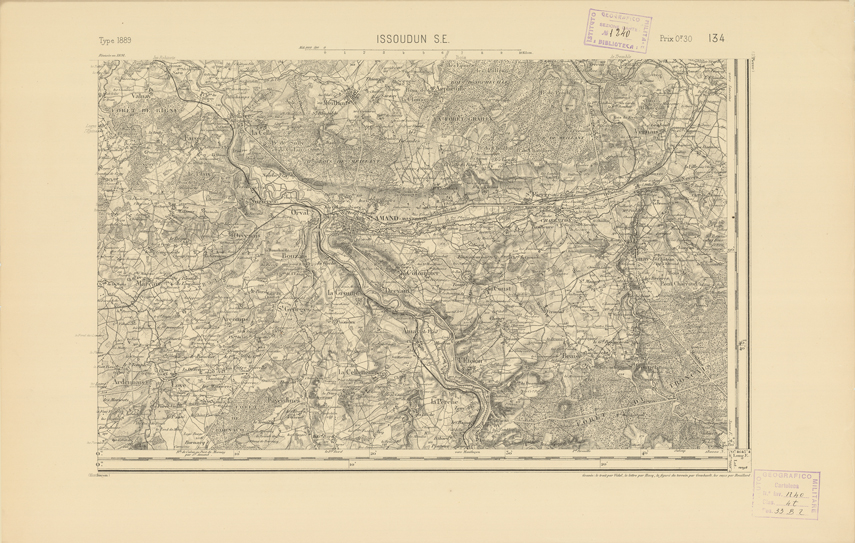 "Paris. Service Géographique de l'Armée, 1889. Ebbe origine dall'Edizione zincografica in quarti di foglio, stabilita dal 1879, per la carta detta de "L'Etat-Major". Infatti non rispondono più il sistema della riproduzione zincografica alle esigenze che la revisione dei fogli imponeva, per un inevitabile logoramento dei rami originali, fu proposta dapprima la correzione degli zinchi, ma questo, importando un lavoro lungo e gravoso, si adottò il procedimento galvanico. I rami galvanici ottenuti e corretti secondo questo sistema presero il nome di "édition type 1889". Allo scopo di facilitare l'incisione fu adoperata la suddivisione in quarti di foglio come per l'edizione zincografica. La revisione dei fogli di questo tipo non fu iniziata che nel 1893. Dal catalogo del S.G.A. risultano mancanti a questa edizione i dipartimenti della "Moselle", del "Bas-Rhin" e del "Haut-Rhin" per i quali non esiste che una edizione in fogli interi aggiornata nel 1901."