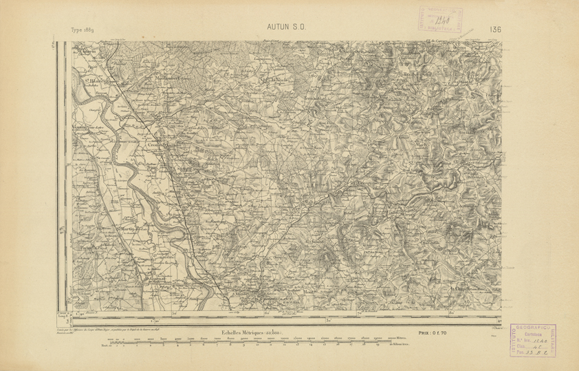 "Paris. Service Géographique de l'Armée, 1889. Ebbe origine dall'Edizione zincografica in quarti di foglio, stabilita dal 1879, per la carta detta de "L'Etat-Major". Infatti non rispondono più il sistema della riproduzione zincografica alle esigenze che la revisione dei fogli imponeva, per un inevitabile logoramento dei rami originali, fu proposta dapprima la correzione degli zinchi, ma questo, importando un lavoro lungo e gravoso, si adottò il procedimento galvanico. I rami galvanici ottenuti e corretti secondo questo sistema presero il nome di "édition type 1889". Allo scopo di facilitare l'incisione fu adoperata la suddivisione in quarti di foglio come per l'edizione zincografica. La revisione dei fogli di questo tipo non fu iniziata che nel 1893. Dal catalogo del S.G.A. risultano mancanti a questa edizione i dipartimenti della "Moselle", del "Bas-Rhin" e del "Haut-Rhin" per i quali non esiste che una edizione in fogli interi aggiornata nel 1901."