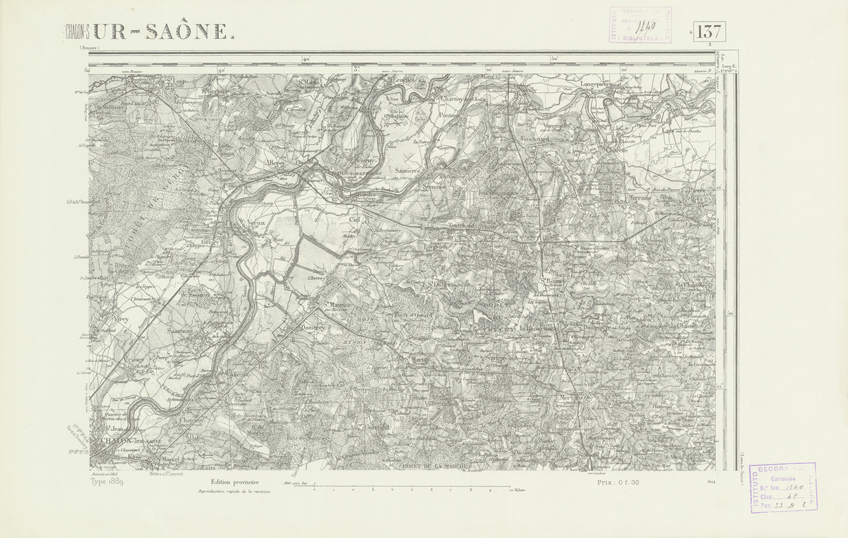 "Paris. Service Géographique de l'Armée, 1889. Ebbe origine dall'Edizione zincografica in quarti di foglio, stabilita dal 1879, per la carta detta de "L'Etat-Major". Infatti non rispondono più il sistema della riproduzione zincografica alle esigenze che la revisione dei fogli imponeva, per un inevitabile logoramento dei rami originali, fu proposta dapprima la correzione degli zinchi, ma questo, importando un lavoro lungo e gravoso, si adottò il procedimento galvanico. I rami galvanici ottenuti e corretti secondo questo sistema presero il nome di "édition type 1889". Allo scopo di facilitare l'incisione fu adoperata la suddivisione in quarti di foglio come per l'edizione zincografica. La revisione dei fogli di questo tipo non fu iniziata che nel 1893. Dal catalogo del S.G.A. risultano mancanti a questa edizione i dipartimenti della "Moselle", del "Bas-Rhin" e del "Haut-Rhin" per i quali non esiste che una edizione in fogli interi aggiornata nel 1901."
