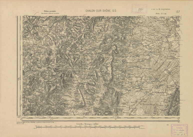 "Paris. Service Géographique de l'Armée, 1889. Ebbe origine dall'Edizione zincografica in quarti di foglio, stabilita dal 1879, per la carta detta de "L'Etat-Major". Infatti non rispondono più il sistema della riproduzione zincografica alle esigenze che la revisione dei fogli imponeva, per un inevitabile logoramento dei rami originali, fu proposta dapprima la correzione degli zinchi, ma questo, importando un lavoro lungo e gravoso, si adottò il procedimento galvanico. I rami galvanici ottenuti e corretti secondo questo sistema presero il nome di "édition type 1889". Allo scopo di facilitare l'incisione fu adoperata la suddivisione in quarti di foglio come per l'edizione zincografica. La revisione dei fogli di questo tipo non fu iniziata che nel 1893. Dal catalogo del S.G.A. risultano mancanti a questa edizione i dipartimenti della "Moselle", del "Bas-Rhin" e del "Haut-Rhin" per i quali non esiste che una edizione in fogli interi aggiornata nel 1901."