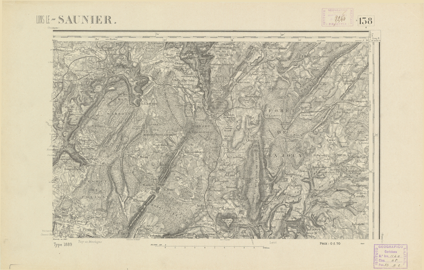 "Paris. Service Géographique de l'Armée, 1889. Ebbe origine dall'Edizione zincografica in quarti di foglio, stabilita dal 1879, per la carta detta de "L'Etat-Major". Infatti non rispondono più il sistema della riproduzione zincografica alle esigenze che la revisione dei fogli imponeva, per un inevitabile logoramento dei rami originali, fu proposta dapprima la correzione degli zinchi, ma questo, importando un lavoro lungo e gravoso, si adottò il procedimento galvanico. I rami galvanici ottenuti e corretti secondo questo sistema presero il nome di "édition type 1889". Allo scopo di facilitare l'incisione fu adoperata la suddivisione in quarti di foglio come per l'edizione zincografica. La revisione dei fogli di questo tipo non fu iniziata che nel 1893. Dal catalogo del S.G.A. risultano mancanti a questa edizione i dipartimenti della "Moselle", del "Bas-Rhin" e del "Haut-Rhin" per i quali non esiste che una edizione in fogli interi aggiornata nel 1901."