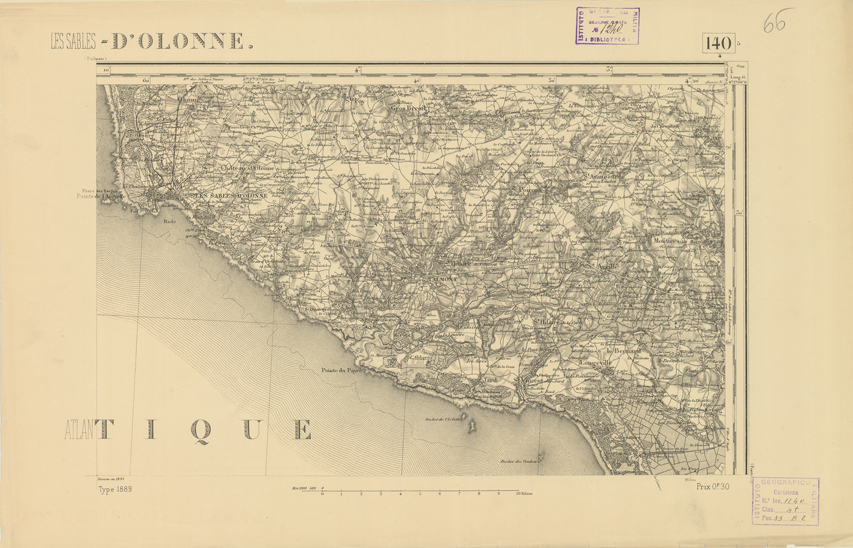 "Paris. Service Géographique de l'Armée, 1889. Ebbe origine dall'Edizione zincografica in quarti di foglio, stabilita dal 1879, per la carta detta de "L'Etat-Major". Infatti non rispondono più il sistema della riproduzione zincografica alle esigenze che la revisione dei fogli imponeva, per un inevitabile logoramento dei rami originali, fu proposta dapprima la correzione degli zinchi, ma questo, importando un lavoro lungo e gravoso, si adottò il procedimento galvanico. I rami galvanici ottenuti e corretti secondo questo sistema presero il nome di "édition type 1889". Allo scopo di facilitare l'incisione fu adoperata la suddivisione in quarti di foglio come per l'edizione zincografica. La revisione dei fogli di questo tipo non fu iniziata che nel 1893. Dal catalogo del S.G.A. risultano mancanti a questa edizione i dipartimenti della "Moselle", del "Bas-Rhin" e del "Haut-Rhin" per i quali non esiste che una edizione in fogli interi aggiornata nel 1901."