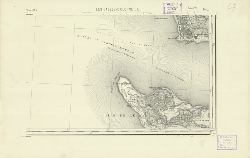 "Paris. Service Géographique de l'Armée, 1889. Ebbe origine dall'Edizione zincografica in quarti di foglio, stabilita dal 1879, per la carta detta de "L'Etat-Major". Infatti non rispondono più il sistema della riproduzione zincografica alle esigenze che la revisione dei fogli imponeva, per un inevitabile logoramento dei rami originali, fu proposta dapprima la correzione degli zinchi, ma questo, importando un lavoro lungo e gravoso, si adottò il procedimento galvanico. I rami galvanici ottenuti e corretti secondo questo sistema presero il nome di "édition type 1889". Allo scopo di facilitare l'incisione fu adoperata la suddivisione in quarti di foglio come per l'edizione zincografica. La revisione dei fogli di questo tipo non fu iniziata che nel 1893. Dal catalogo del S.G.A. risultano mancanti a questa edizione i dipartimenti della "Moselle", del "Bas-Rhin" e del "Haut-Rhin" per i quali non esiste che una edizione in fogli interi aggiornata nel 1901."