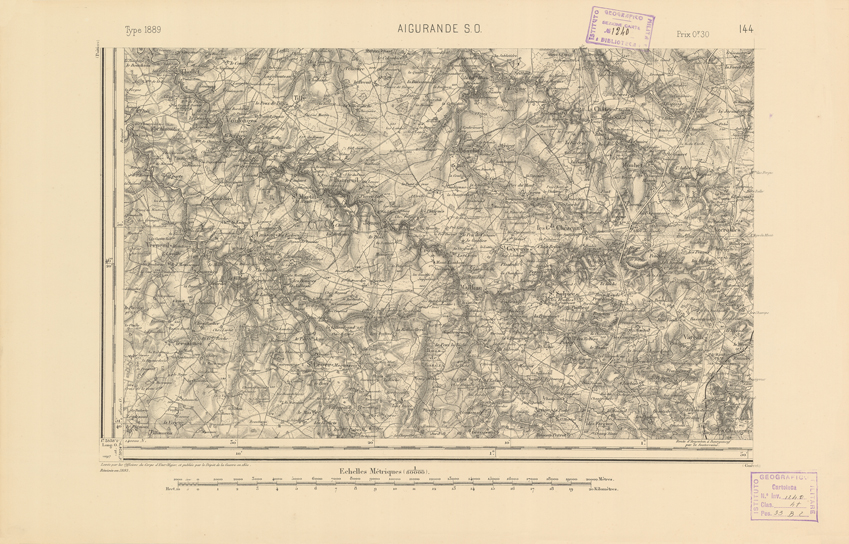 "Paris. Service Géographique de l'Armée, 1889. Ebbe origine dall'Edizione zincografica in quarti di foglio, stabilita dal 1879, per la carta detta de "L'Etat-Major". Infatti non rispondono più il sistema della riproduzione zincografica alle esigenze che la revisione dei fogli imponeva, per un inevitabile logoramento dei rami originali, fu proposta dapprima la correzione degli zinchi, ma questo, importando un lavoro lungo e gravoso, si adottò il procedimento galvanico. I rami galvanici ottenuti e corretti secondo questo sistema presero il nome di "édition type 1889". Allo scopo di facilitare l'incisione fu adoperata la suddivisione in quarti di foglio come per l'edizione zincografica. La revisione dei fogli di questo tipo non fu iniziata che nel 1893. Dal catalogo del S.G.A. risultano mancanti a questa edizione i dipartimenti della "Moselle", del "Bas-Rhin" e del "Haut-Rhin" per i quali non esiste che una edizione in fogli interi aggiornata nel 1901."