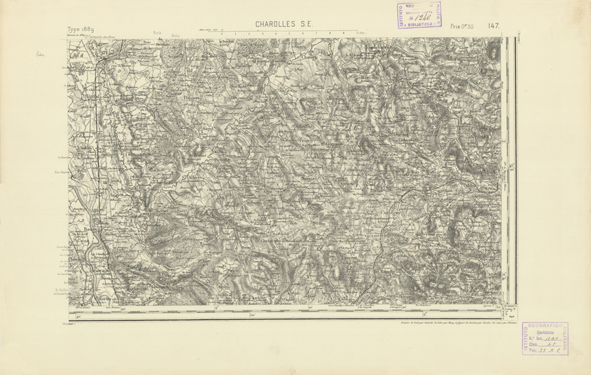 "Paris. Service Géographique de l'Armée, 1889. Ebbe origine dall'Edizione zincografica in quarti di foglio, stabilita dal 1879, per la carta detta de "L'Etat-Major". Infatti non rispondono più il sistema della riproduzione zincografica alle esigenze che la revisione dei fogli imponeva, per un inevitabile logoramento dei rami originali, fu proposta dapprima la correzione degli zinchi, ma questo, importando un lavoro lungo e gravoso, si adottò il procedimento galvanico. I rami galvanici ottenuti e corretti secondo questo sistema presero il nome di "édition type 1889". Allo scopo di facilitare l'incisione fu adoperata la suddivisione in quarti di foglio come per l'edizione zincografica. La revisione dei fogli di questo tipo non fu iniziata che nel 1893. Dal catalogo del S.G.A. risultano mancanti a questa edizione i dipartimenti della "Moselle", del "Bas-Rhin" e del "Haut-Rhin" per i quali non esiste che una edizione in fogli interi aggiornata nel 1901."