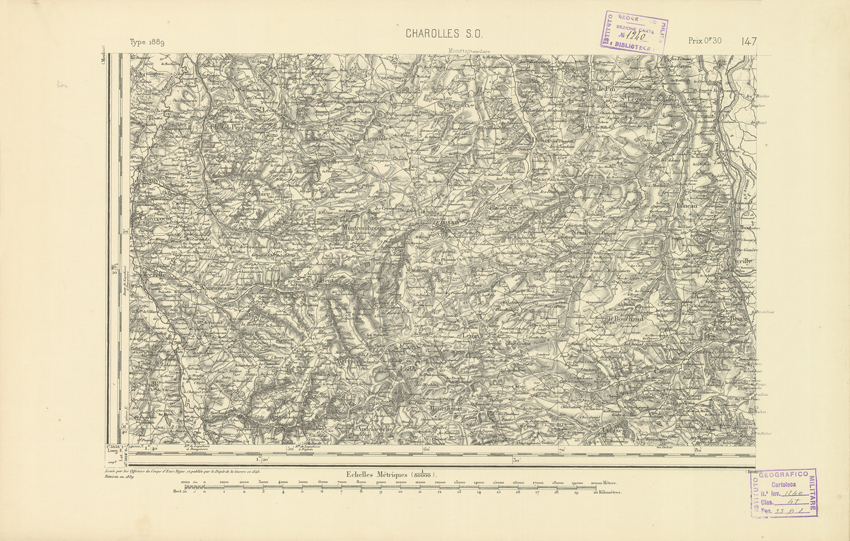 "Paris. Service Géographique de l'Armée, 1889. Ebbe origine dall'Edizione zincografica in quarti di foglio, stabilita dal 1879, per la carta detta de "L'Etat-Major". Infatti non rispondono più il sistema della riproduzione zincografica alle esigenze che la revisione dei fogli imponeva, per un inevitabile logoramento dei rami originali, fu proposta dapprima la correzione degli zinchi, ma questo, importando un lavoro lungo e gravoso, si adottò il procedimento galvanico. I rami galvanici ottenuti e corretti secondo questo sistema presero il nome di "édition type 1889". Allo scopo di facilitare l'incisione fu adoperata la suddivisione in quarti di foglio come per l'edizione zincografica. La revisione dei fogli di questo tipo non fu iniziata che nel 1893. Dal catalogo del S.G.A. risultano mancanti a questa edizione i dipartimenti della "Moselle", del "Bas-Rhin" e del "Haut-Rhin" per i quali non esiste che una edizione in fogli interi aggiornata nel 1901."