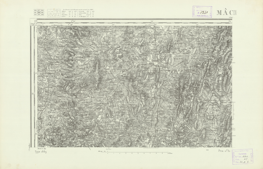 "Paris. Service Géographique de l'Armée, 1889. Ebbe origine dall'Edizione zincografica in quarti di foglio, stabilita dal 1879, per la carta detta de "L'Etat-Major". Infatti non rispondono più il sistema della riproduzione zincografica alle esigenze che la revisione dei fogli imponeva, per un inevitabile logoramento dei rami originali, fu proposta dapprima la correzione degli zinchi, ma questo, importando un lavoro lungo e gravoso, si adottò il procedimento galvanico. I rami galvanici ottenuti e corretti secondo questo sistema presero il nome di "édition type 1889". Allo scopo di facilitare l'incisione fu adoperata la suddivisione in quarti di foglio come per l'edizione zincografica. La revisione dei fogli di questo tipo non fu iniziata che nel 1893. Dal catalogo del S.G.A. risultano mancanti a questa edizione i dipartimenti della "Moselle", del "Bas-Rhin" e del "Haut-Rhin" per i quali non esiste che una edizione in fogli interi aggiornata nel 1901."
