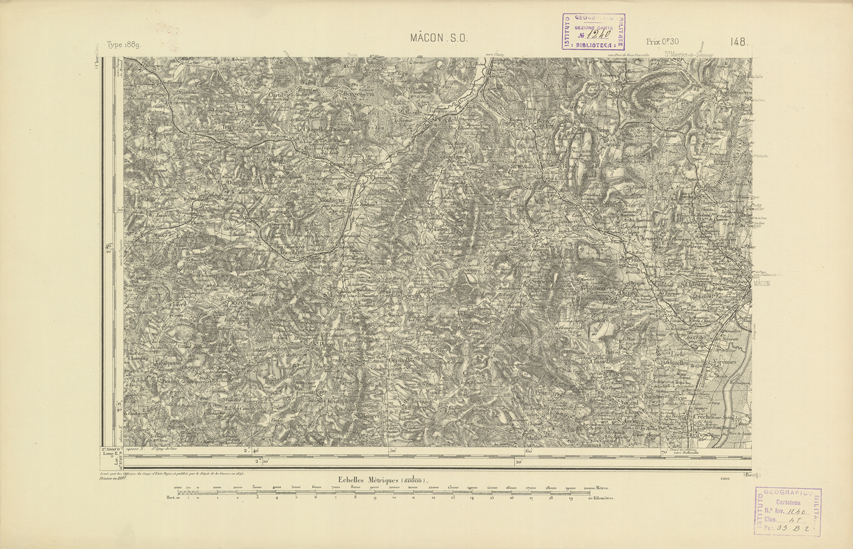 "Paris. Service Géographique de l'Armée, 1889. Ebbe origine dall'Edizione zincografica in quarti di foglio, stabilita dal 1879, per la carta detta de "L'Etat-Major". Infatti non rispondono più il sistema della riproduzione zincografica alle esigenze che la revisione dei fogli imponeva, per un inevitabile logoramento dei rami originali, fu proposta dapprima la correzione degli zinchi, ma questo, importando un lavoro lungo e gravoso, si adottò il procedimento galvanico. I rami galvanici ottenuti e corretti secondo questo sistema presero il nome di "édition type 1889". Allo scopo di facilitare l'incisione fu adoperata la suddivisione in quarti di foglio come per l'edizione zincografica. La revisione dei fogli di questo tipo non fu iniziata che nel 1893. Dal catalogo del S.G.A. risultano mancanti a questa edizione i dipartimenti della "Moselle", del "Bas-Rhin" e del "Haut-Rhin" per i quali non esiste che una edizione in fogli interi aggiornata nel 1901."