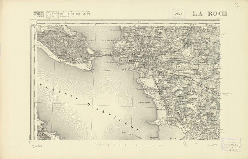 "Paris. Service Géographique de l'Armée, 1889. Ebbe origine dall'Edizione zincografica in quarti di foglio, stabilita dal 1879, per la carta detta de "L'Etat-Major". Infatti non rispondono più il sistema della riproduzione zincografica alle esigenze che la revisione dei fogli imponeva, per un inevitabile logoramento dei rami originali, fu proposta dapprima la correzione degli zinchi, ma questo, importando un lavoro lungo e gravoso, si adottò il procedimento galvanico. I rami galvanici ottenuti e corretti secondo questo sistema presero il nome di "édition type 1889". Allo scopo di facilitare l'incisione fu adoperata la suddivisione in quarti di foglio come per l'edizione zincografica. La revisione dei fogli di questo tipo non fu iniziata che nel 1893. Dal catalogo del S.G.A. risultano mancanti a questa edizione i dipartimenti della "Moselle", del "Bas-Rhin" e del "Haut-Rhin" per i quali non esiste che una edizione in fogli interi aggiornata nel 1901."