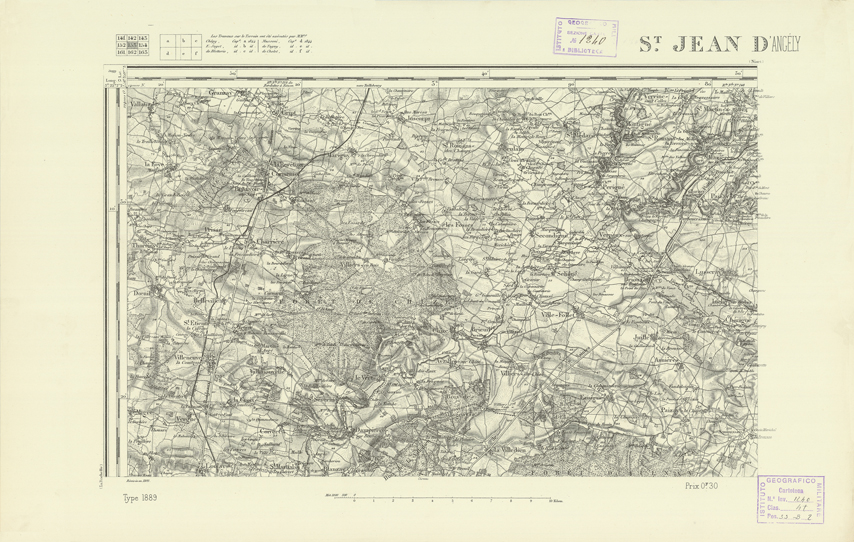 "Paris. Service Géographique de l'Armée, 1889. Ebbe origine dall'Edizione zincografica in quarti di foglio, stabilita dal 1879, per la carta detta de "L'Etat-Major". Infatti non rispondono più il sistema della riproduzione zincografica alle esigenze che la revisione dei fogli imponeva, per un inevitabile logoramento dei rami originali, fu proposta dapprima la correzione degli zinchi, ma questo, importando un lavoro lungo e gravoso, si adottò il procedimento galvanico. I rami galvanici ottenuti e corretti secondo questo sistema presero il nome di "édition type 1889". Allo scopo di facilitare l'incisione fu adoperata la suddivisione in quarti di foglio come per l'edizione zincografica. La revisione dei fogli di questo tipo non fu iniziata che nel 1893. Dal catalogo del S.G.A. risultano mancanti a questa edizione i dipartimenti della "Moselle", del "Bas-Rhin" e del "Haut-Rhin" per i quali non esiste che una edizione in fogli interi aggiornata nel 1901."