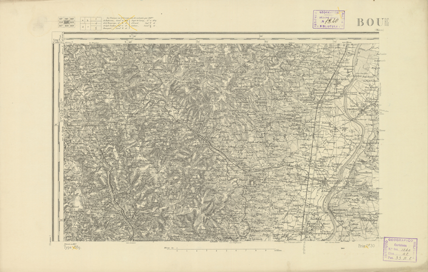 "Paris. Service Géographique de l'Armée, 1889. Ebbe origine dall'Edizione zincografica in quarti di foglio, stabilita dal 1879, per la carta detta de "L'Etat-Major". Infatti non rispondono più il sistema della riproduzione zincografica alle esigenze che la revisione dei fogli imponeva, per un inevitabile logoramento dei rami originali, fu proposta dapprima la correzione degli zinchi, ma questo, importando un lavoro lungo e gravoso, si adottò il procedimento galvanico. I rami galvanici ottenuti e corretti secondo questo sistema presero il nome di "édition type 1889". Allo scopo di facilitare l'incisione fu adoperata la suddivisione in quarti di foglio come per l'edizione zincografica. La revisione dei fogli di questo tipo non fu iniziata che nel 1893. Dal catalogo del S.G.A. risultano mancanti a questa edizione i dipartimenti della "Moselle", del "Bas-Rhin" e del "Haut-Rhin" per i quali non esiste che una edizione in fogli interi aggiornata nel 1901."