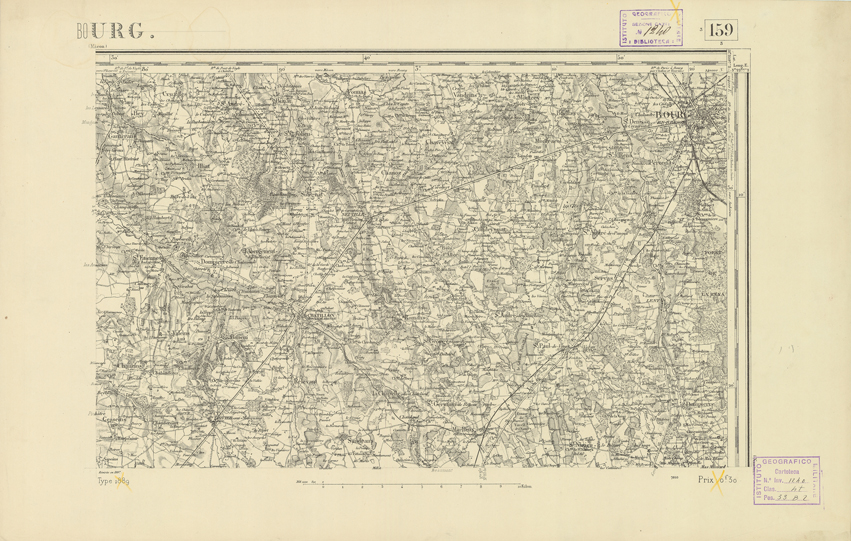 "Paris. Service Géographique de l'Armée, 1889. Ebbe origine dall'Edizione zincografica in quarti di foglio, stabilita dal 1879, per la carta detta de "L'Etat-Major". Infatti non rispondono più il sistema della riproduzione zincografica alle esigenze che la revisione dei fogli imponeva, per un inevitabile logoramento dei rami originali, fu proposta dapprima la correzione degli zinchi, ma questo, importando un lavoro lungo e gravoso, si adottò il procedimento galvanico. I rami galvanici ottenuti e corretti secondo questo sistema presero il nome di "édition type 1889". Allo scopo di facilitare l'incisione fu adoperata la suddivisione in quarti di foglio come per l'edizione zincografica. La revisione dei fogli di questo tipo non fu iniziata che nel 1893. Dal catalogo del S.G.A. risultano mancanti a questa edizione i dipartimenti della "Moselle", del "Bas-Rhin" e del "Haut-Rhin" per i quali non esiste che una edizione in fogli interi aggiornata nel 1901."