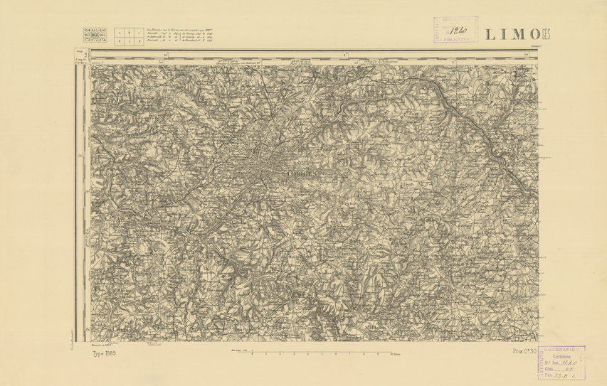 "Paris. Service Géographique de l'Armée, 1889. Ebbe origine dall'Edizione zincografica in quarti di foglio, stabilita dal 1879, per la carta detta de "L'Etat-Major". Infatti non rispondono più il sistema della riproduzione zincografica alle esigenze che la revisione dei fogli imponeva, per un inevitabile logoramento dei rami originali, fu proposta dapprima la correzione degli zinchi, ma questo, importando un lavoro lungo e gravoso, si adottò il procedimento galvanico. I rami galvanici ottenuti e corretti secondo questo sistema presero il nome di "édition type 1889". Allo scopo di facilitare l'incisione fu adoperata la suddivisione in quarti di foglio come per l'edizione zincografica. La revisione dei fogli di questo tipo non fu iniziata che nel 1893. Dal catalogo del S.G.A. risultano mancanti a questa edizione i dipartimenti della "Moselle", del "Bas-Rhin" e del "Haut-Rhin" per i quali non esiste che una edizione in fogli interi aggiornata nel 1901."