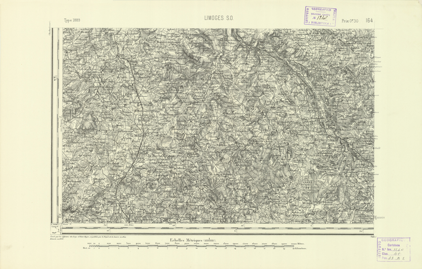 "Paris. Service Géographique de l'Armée, 1889. Ebbe origine dall'Edizione zincografica in quarti di foglio, stabilita dal 1879, per la carta detta de "L'Etat-Major". Infatti non rispondono più il sistema della riproduzione zincografica alle esigenze che la revisione dei fogli imponeva, per un inevitabile logoramento dei rami originali, fu proposta dapprima la correzione degli zinchi, ma questo, importando un lavoro lungo e gravoso, si adottò il procedimento galvanico. I rami galvanici ottenuti e corretti secondo questo sistema presero il nome di "édition type 1889". Allo scopo di facilitare l'incisione fu adoperata la suddivisione in quarti di foglio come per l'edizione zincografica. La revisione dei fogli di questo tipo non fu iniziata che nel 1893. Dal catalogo del S.G.A. risultano mancanti a questa edizione i dipartimenti della "Moselle", del "Bas-Rhin" e del "Haut-Rhin" per i quali non esiste che una edizione in fogli interi aggiornata nel 1901."