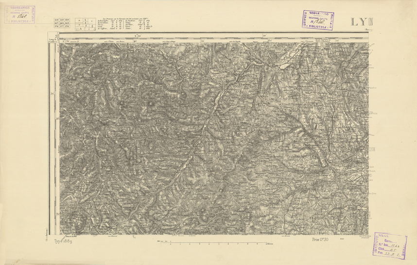"Paris. Service Géographique de l'Armée, 1889. Ebbe origine dall'Edizione zincografica in quarti di foglio, stabilita dal 1879, per la carta detta de "L'Etat-Major". Infatti non rispondono più il sistema della riproduzione zincografica alle esigenze che la revisione dei fogli imponeva, per un inevitabile logoramento dei rami originali, fu proposta dapprima la correzione degli zinchi, ma questo, importando un lavoro lungo e gravoso, si adottò il procedimento galvanico. I rami galvanici ottenuti e corretti secondo questo sistema presero il nome di "édition type 1889". Allo scopo di facilitare l'incisione fu adoperata la suddivisione in quarti di foglio come per l'edizione zincografica. La revisione dei fogli di questo tipo non fu iniziata che nel 1893. Dal catalogo del S.G.A. risultano mancanti a questa edizione i dipartimenti della "Moselle", del "Bas-Rhin" e del "Haut-Rhin" per i quali non esiste che una edizione in fogli interi aggiornata nel 1901."