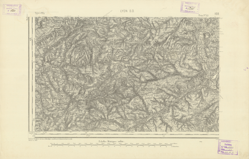 "Paris. Service Géographique de l'Armée, 1889. Ebbe origine dall'Edizione zincografica in quarti di foglio, stabilita dal 1879, per la carta detta de "L'Etat-Major". Infatti non rispondono più il sistema della riproduzione zincografica alle esigenze che la revisione dei fogli imponeva, per un inevitabile logoramento dei rami originali, fu proposta dapprima la correzione degli zinchi, ma questo, importando un lavoro lungo e gravoso, si adottò il procedimento galvanico. I rami galvanici ottenuti e corretti secondo questo sistema presero il nome di "édition type 1889". Allo scopo di facilitare l'incisione fu adoperata la suddivisione in quarti di foglio come per l'edizione zincografica. La revisione dei fogli di questo tipo non fu iniziata che nel 1893. Dal catalogo del S.G.A. risultano mancanti a questa edizione i dipartimenti della "Moselle", del "Bas-Rhin" e del "Haut-Rhin" per i quali non esiste che una edizione in fogli interi aggiornata nel 1901."