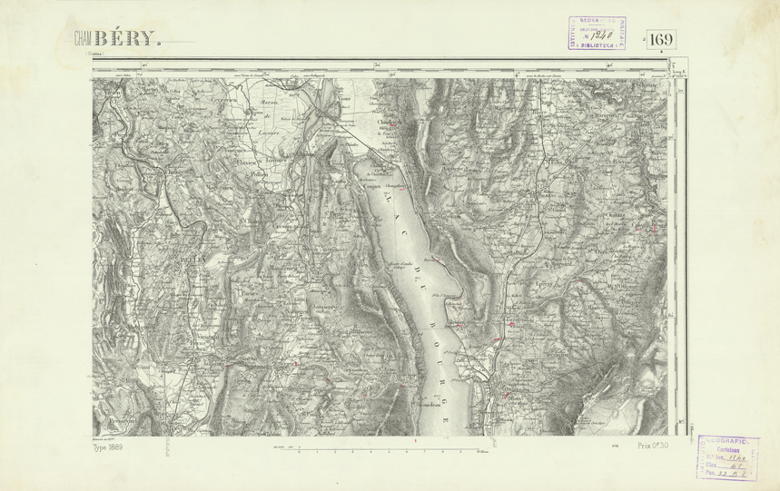 "Paris. Service Géographique de l'Armée, 1889. Ebbe origine dall'Edizione zincografica in quarti di foglio, stabilita dal 1879, per la carta detta de "L'Etat-Major". Infatti non rispondono più il sistema della riproduzione zincografica alle esigenze che la revisione dei fogli imponeva, per un inevitabile logoramento dei rami originali, fu proposta dapprima la correzione degli zinchi, ma questo, importando un lavoro lungo e gravoso, si adottò il procedimento galvanico. I rami galvanici ottenuti e corretti secondo questo sistema presero il nome di "édition type 1889". Allo scopo di facilitare l'incisione fu adoperata la suddivisione in quarti di foglio come per l'edizione zincografica. La revisione dei fogli di questo tipo non fu iniziata che nel 1893. Dal catalogo del S.G.A. risultano mancanti a questa edizione i dipartimenti della "Moselle", del "Bas-Rhin" e del "Haut-Rhin" per i quali non esiste che una edizione in fogli interi aggiornata nel 1901."
