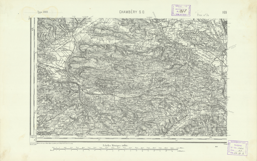 "Paris. Service Géographique de l'Armée, 1889. Ebbe origine dall'Edizione zincografica in quarti di foglio, stabilita dal 1879, per la carta detta de "L'Etat-Major". Infatti non rispondono più il sistema della riproduzione zincografica alle esigenze che la revisione dei fogli imponeva, per un inevitabile logoramento dei rami originali, fu proposta dapprima la correzione degli zinchi, ma questo, importando un lavoro lungo e gravoso, si adottò il procedimento galvanico. I rami galvanici ottenuti e corretti secondo questo sistema presero il nome di "édition type 1889". Allo scopo di facilitare l'incisione fu adoperata la suddivisione in quarti di foglio come per l'edizione zincografica. La revisione dei fogli di questo tipo non fu iniziata che nel 1893. Dal catalogo del S.G.A. risultano mancanti a questa edizione i dipartimenti della "Moselle", del "Bas-Rhin" e del "Haut-Rhin" per i quali non esiste che una edizione in fogli interi aggiornata nel 1901."