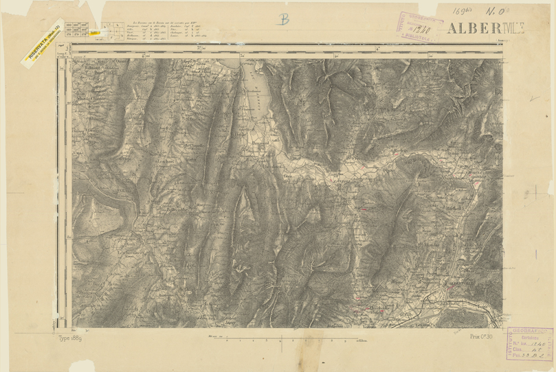"Paris. Service Géographique de l'Armée, 1889. Ebbe origine dall'Edizione zincografica in quarti di foglio, stabilita dal 1879, per la carta detta de "L'Etat-Major". Infatti non rispondono più il sistema della riproduzione zincografica alle esigenze che la revisione dei fogli imponeva, per un inevitabile logoramento dei rami originali, fu proposta dapprima la correzione degli zinchi, ma questo, importando un lavoro lungo e gravoso, si adottò il procedimento galvanico. I rami galvanici ottenuti e corretti secondo questo sistema presero il nome di "édition type 1889". Allo scopo di facilitare l'incisione fu adoperata la suddivisione in quarti di foglio come per l'edizione zincografica. La revisione dei fogli di questo tipo non fu iniziata che nel 1893. Dal catalogo del S.G.A. risultano mancanti a questa edizione i dipartimenti della "Moselle", del "Bas-Rhin" e del "Haut-Rhin" per i quali non esiste che una edizione in fogli interi aggiornata nel 1901."