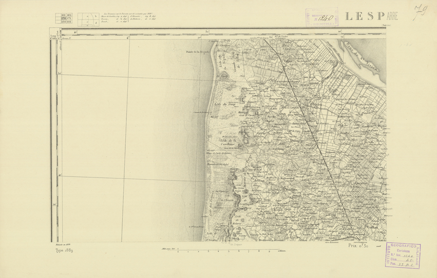 "Paris. Service Géographique de l'Armée, 1889. Ebbe origine dall'Edizione zincografica in quarti di foglio, stabilita dal 1879, per la carta detta de "L'Etat-Major". Infatti non rispondono più il sistema della riproduzione zincografica alle esigenze che la revisione dei fogli imponeva, per un inevitabile logoramento dei rami originali, fu proposta dapprima la correzione degli zinchi, ma questo, importando un lavoro lungo e gravoso, si adottò il procedimento galvanico. I rami galvanici ottenuti e corretti secondo questo sistema presero il nome di "édition type 1889". Allo scopo di facilitare l'incisione fu adoperata la suddivisione in quarti di foglio come per l'edizione zincografica. La revisione dei fogli di questo tipo non fu iniziata che nel 1893. Dal catalogo del S.G.A. risultano mancanti a questa edizione i dipartimenti della "Moselle", del "Bas-Rhin" e del "Haut-Rhin" per i quali non esiste che una edizione in fogli interi aggiornata nel 1901."