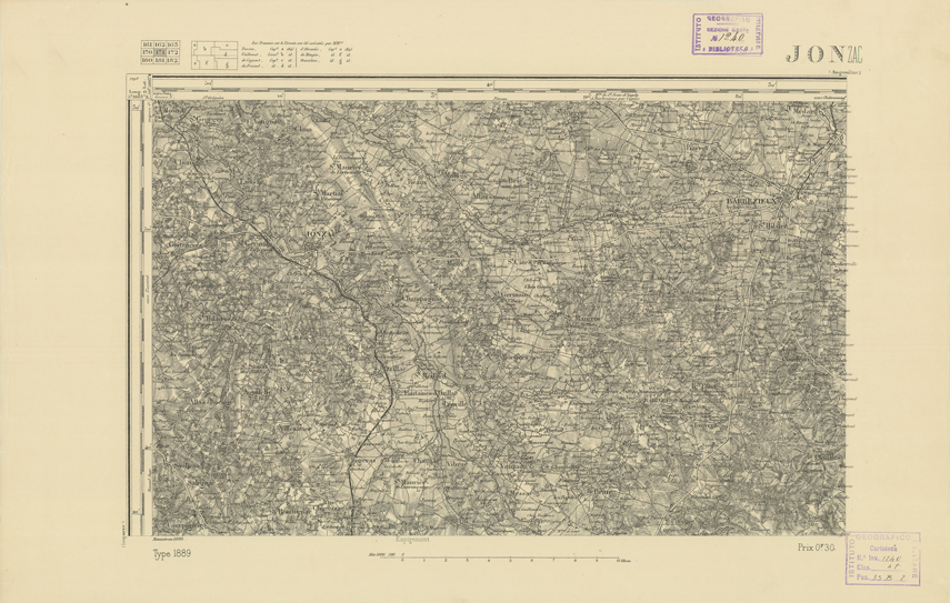 "Paris. Service Géographique de l'Armée, 1889. Ebbe origine dall'Edizione zincografica in quarti di foglio, stabilita dal 1879, per la carta detta de "L'Etat-Major". Infatti non rispondono più il sistema della riproduzione zincografica alle esigenze che la revisione dei fogli imponeva, per un inevitabile logoramento dei rami originali, fu proposta dapprima la correzione degli zinchi, ma questo, importando un lavoro lungo e gravoso, si adottò il procedimento galvanico. I rami galvanici ottenuti e corretti secondo questo sistema presero il nome di "édition type 1889". Allo scopo di facilitare l'incisione fu adoperata la suddivisione in quarti di foglio come per l'edizione zincografica. La revisione dei fogli di questo tipo non fu iniziata che nel 1893. Dal catalogo del S.G.A. risultano mancanti a questa edizione i dipartimenti della "Moselle", del "Bas-Rhin" e del "Haut-Rhin" per i quali non esiste che una edizione in fogli interi aggiornata nel 1901."