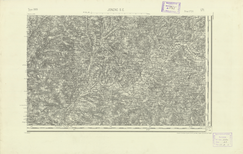 "Paris. Service Géographique de l'Armée, 1889. Ebbe origine dall'Edizione zincografica in quarti di foglio, stabilita dal 1879, per la carta detta de "L'Etat-Major". Infatti non rispondono più il sistema della riproduzione zincografica alle esigenze che la revisione dei fogli imponeva, per un inevitabile logoramento dei rami originali, fu proposta dapprima la correzione degli zinchi, ma questo, importando un lavoro lungo e gravoso, si adottò il procedimento galvanico. I rami galvanici ottenuti e corretti secondo questo sistema presero il nome di "édition type 1889". Allo scopo di facilitare l'incisione fu adoperata la suddivisione in quarti di foglio come per l'edizione zincografica. La revisione dei fogli di questo tipo non fu iniziata che nel 1893. Dal catalogo del S.G.A. risultano mancanti a questa edizione i dipartimenti della "Moselle", del "Bas-Rhin" e del "Haut-Rhin" per i quali non esiste che una edizione in fogli interi aggiornata nel 1901."