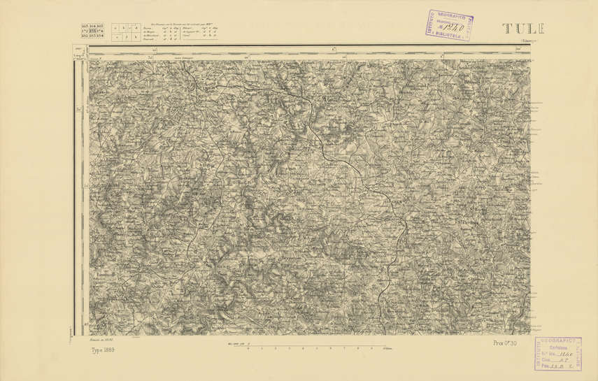 "Paris. Service Géographique de l'Armée, 1889. Ebbe origine dall'Edizione zincografica in quarti di foglio, stabilita dal 1879, per la carta detta de "L'Etat-Major". Infatti non rispondono più il sistema della riproduzione zincografica alle esigenze che la revisione dei fogli imponeva, per un inevitabile logoramento dei rami originali, fu proposta dapprima la correzione degli zinchi, ma questo, importando un lavoro lungo e gravoso, si adottò il procedimento galvanico. I rami galvanici ottenuti e corretti secondo questo sistema presero il nome di "édition type 1889". Allo scopo di facilitare l'incisione fu adoperata la suddivisione in quarti di foglio come per l'edizione zincografica. La revisione dei fogli di questo tipo non fu iniziata che nel 1893. Dal catalogo del S.G.A. risultano mancanti a questa edizione i dipartimenti della "Moselle", del "Bas-Rhin" e del "Haut-Rhin" per i quali non esiste che una edizione in fogli interi aggiornata nel 1901."