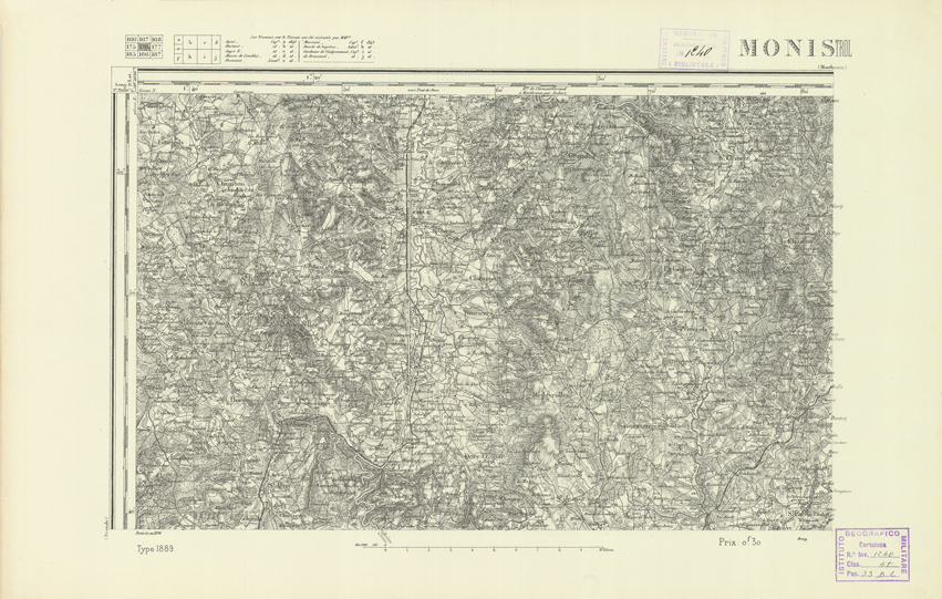 "Paris. Service Géographique de l'Armée, 1889. Ebbe origine dall'Edizione zincografica in quarti di foglio, stabilita dal 1879, per la carta detta de "L'Etat-Major". Infatti non rispondono più il sistema della riproduzione zincografica alle esigenze che la revisione dei fogli imponeva, per un inevitabile logoramento dei rami originali, fu proposta dapprima la correzione degli zinchi, ma questo, importando un lavoro lungo e gravoso, si adottò il procedimento galvanico. I rami galvanici ottenuti e corretti secondo questo sistema presero il nome di "édition type 1889". Allo scopo di facilitare l'incisione fu adoperata la suddivisione in quarti di foglio come per l'edizione zincografica. La revisione dei fogli di questo tipo non fu iniziata che nel 1893. Dal catalogo del S.G.A. risultano mancanti a questa edizione i dipartimenti della "Moselle", del "Bas-Rhin" e del "Haut-Rhin" per i quali non esiste che una edizione in fogli interi aggiornata nel 1901."