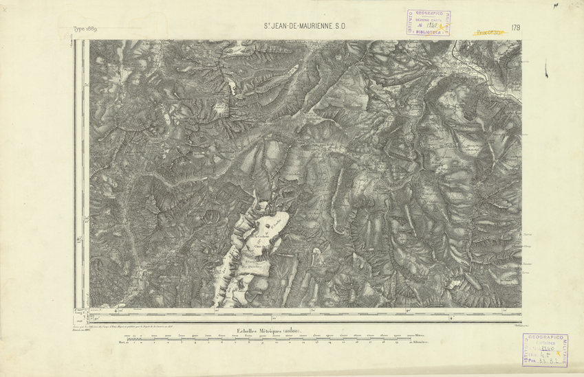 "Paris. Service Géographique de l'Armée, 1889. Ebbe origine dall'Edizione zincografica in quarti di foglio, stabilita dal 1879, per la carta detta de "L'Etat-Major". Infatti non rispondono più il sistema della riproduzione zincografica alle esigenze che la revisione dei fogli imponeva, per un inevitabile logoramento dei rami originali, fu proposta dapprima la correzione degli zinchi, ma questo, importando un lavoro lungo e gravoso, si adottò il procedimento galvanico. I rami galvanici ottenuti e corretti secondo questo sistema presero il nome di "édition type 1889". Allo scopo di facilitare l'incisione fu adoperata la suddivisione in quarti di foglio come per l'edizione zincografica. La revisione dei fogli di questo tipo non fu iniziata che nel 1893. Dal catalogo del S.G.A. risultano mancanti a questa edizione i dipartimenti della "Moselle", del "Bas-Rhin" e del "Haut-Rhin" per i quali non esiste che una edizione in fogli interi aggiornata nel 1901."