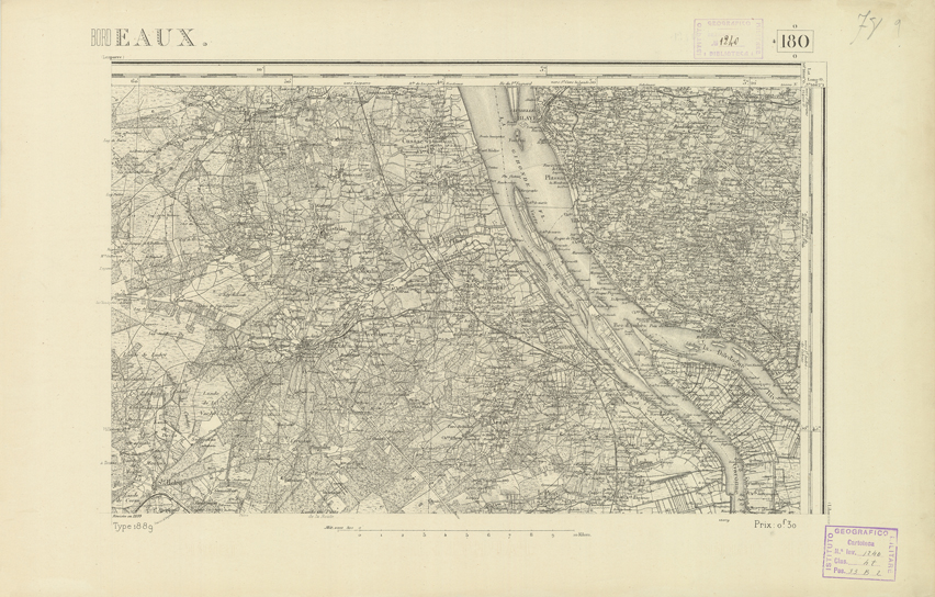 "Paris. Service Géographique de l'Armée, 1889. Ebbe origine dall'Edizione zincografica in quarti di foglio, stabilita dal 1879, per la carta detta de "L'Etat-Major". Infatti non rispondono più il sistema della riproduzione zincografica alle esigenze che la revisione dei fogli imponeva, per un inevitabile logoramento dei rami originali, fu proposta dapprima la correzione degli zinchi, ma questo, importando un lavoro lungo e gravoso, si adottò il procedimento galvanico. I rami galvanici ottenuti e corretti secondo questo sistema presero il nome di "édition type 1889". Allo scopo di facilitare l'incisione fu adoperata la suddivisione in quarti di foglio come per l'edizione zincografica. La revisione dei fogli di questo tipo non fu iniziata che nel 1893. Dal catalogo del S.G.A. risultano mancanti a questa edizione i dipartimenti della "Moselle", del "Bas-Rhin" e del "Haut-Rhin" per i quali non esiste che una edizione in fogli interi aggiornata nel 1901."
