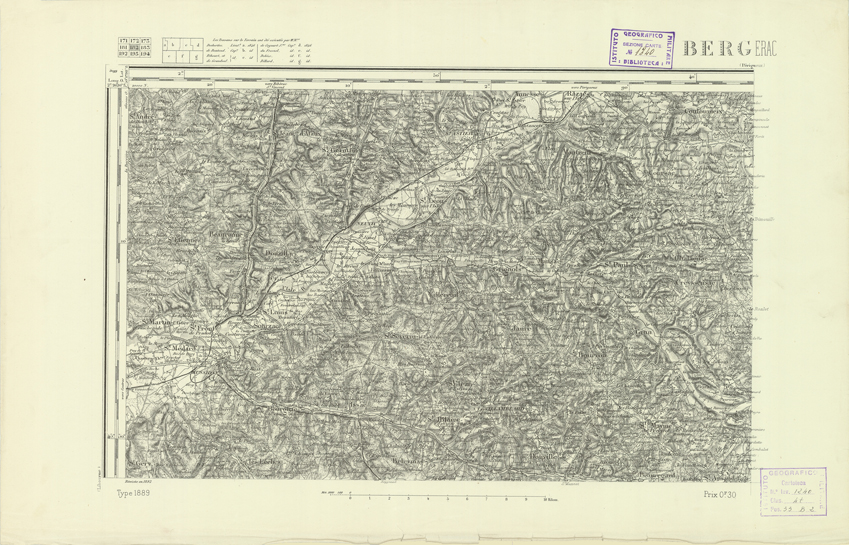 "Paris. Service Géographique de l'Armée, 1889. Ebbe origine dall'Edizione zincografica in quarti di foglio, stabilita dal 1879, per la carta detta de "L'Etat-Major". Infatti non rispondono più il sistema della riproduzione zincografica alle esigenze che la revisione dei fogli imponeva, per un inevitabile logoramento dei rami originali, fu proposta dapprima la correzione degli zinchi, ma questo, importando un lavoro lungo e gravoso, si adottò il procedimento galvanico. I rami galvanici ottenuti e corretti secondo questo sistema presero il nome di "édition type 1889". Allo scopo di facilitare l'incisione fu adoperata la suddivisione in quarti di foglio come per l'edizione zincografica. La revisione dei fogli di questo tipo non fu iniziata che nel 1893. Dal catalogo del S.G.A. risultano mancanti a questa edizione i dipartimenti della "Moselle", del "Bas-Rhin" e del "Haut-Rhin" per i quali non esiste che una edizione in fogli interi aggiornata nel 1901."