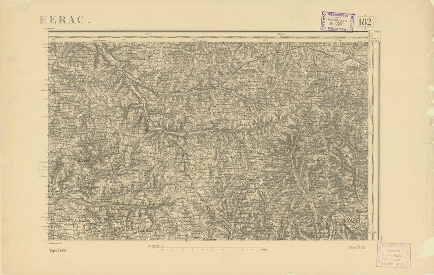 "Paris. Service Géographique de l'Armée, 1889. Ebbe origine dall'Edizione zincografica in quarti di foglio, stabilita dal 1879, per la carta detta de "L'Etat-Major". Infatti non rispondono più il sistema della riproduzione zincografica alle esigenze che la revisione dei fogli imponeva, per un inevitabile logoramento dei rami originali, fu proposta dapprima la correzione degli zinchi, ma questo, importando un lavoro lungo e gravoso, si adottò il procedimento galvanico. I rami galvanici ottenuti e corretti secondo questo sistema presero il nome di "édition type 1889". Allo scopo di facilitare l'incisione fu adoperata la suddivisione in quarti di foglio come per l'edizione zincografica. La revisione dei fogli di questo tipo non fu iniziata che nel 1893. Dal catalogo del S.G.A. risultano mancanti a questa edizione i dipartimenti della "Moselle", del "Bas-Rhin" e del "Haut-Rhin" per i quali non esiste che una edizione in fogli interi aggiornata nel 1901."