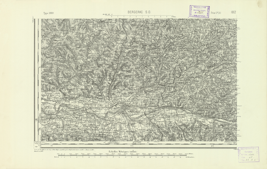"Paris. Service Géographique de l'Armée, 1889. Ebbe origine dall'Edizione zincografica in quarti di foglio, stabilita dal 1879, per la carta detta de "L'Etat-Major". Infatti non rispondono più il sistema della riproduzione zincografica alle esigenze che la revisione dei fogli imponeva, per un inevitabile logoramento dei rami originali, fu proposta dapprima la correzione degli zinchi, ma questo, importando un lavoro lungo e gravoso, si adottò il procedimento galvanico. I rami galvanici ottenuti e corretti secondo questo sistema presero il nome di "édition type 1889". Allo scopo di facilitare l'incisione fu adoperata la suddivisione in quarti di foglio come per l'edizione zincografica. La revisione dei fogli di questo tipo non fu iniziata che nel 1893. Dal catalogo del S.G.A. risultano mancanti a questa edizione i dipartimenti della "Moselle", del "Bas-Rhin" e del "Haut-Rhin" per i quali non esiste che una edizione in fogli interi aggiornata nel 1901."