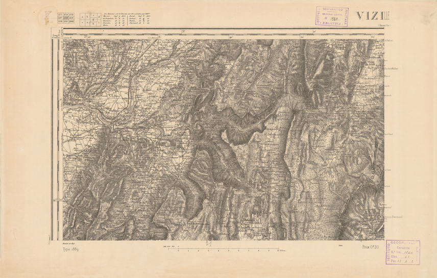 "Paris. Service Géographique de l'Armée, 1889. Ebbe origine dall'Edizione zincografica in quarti di foglio, stabilita dal 1879, per la carta detta de "L'Etat-Major". Infatti non rispondono più il sistema della riproduzione zincografica alle esigenze che la revisione dei fogli imponeva, per un inevitabile logoramento dei rami originali, fu proposta dapprima la correzione degli zinchi, ma questo, importando un lavoro lungo e gravoso, si adottò il procedimento galvanico. I rami galvanici ottenuti e corretti secondo questo sistema presero il nome di "édition type 1889". Allo scopo di facilitare l'incisione fu adoperata la suddivisione in quarti di foglio come per l'edizione zincografica. La revisione dei fogli di questo tipo non fu iniziata che nel 1893. Dal catalogo del S.G.A. risultano mancanti a questa edizione i dipartimenti della "Moselle", del "Bas-Rhin" e del "Haut-Rhin" per i quali non esiste che una edizione in fogli interi aggiornata nel 1901."