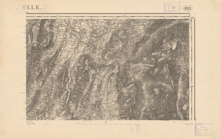 "Paris. Service Géographique de l'Armée, 1889. Ebbe origine dall'Edizione zincografica in quarti di foglio, stabilita dal 1879, per la carta detta de "L'Etat-Major". Infatti non rispondono più il sistema della riproduzione zincografica alle esigenze che la revisione dei fogli imponeva, per un inevitabile logoramento dei rami originali, fu proposta dapprima la correzione degli zinchi, ma questo, importando un lavoro lungo e gravoso, si adottò il procedimento galvanico. I rami galvanici ottenuti e corretti secondo questo sistema presero il nome di "édition type 1889". Allo scopo di facilitare l'incisione fu adoperata la suddivisione in quarti di foglio come per l'edizione zincografica. La revisione dei fogli di questo tipo non fu iniziata che nel 1893. Dal catalogo del S.G.A. risultano mancanti a questa edizione i dipartimenti della "Moselle", del "Bas-Rhin" e del "Haut-Rhin" per i quali non esiste che una edizione in fogli interi aggiornata nel 1901."