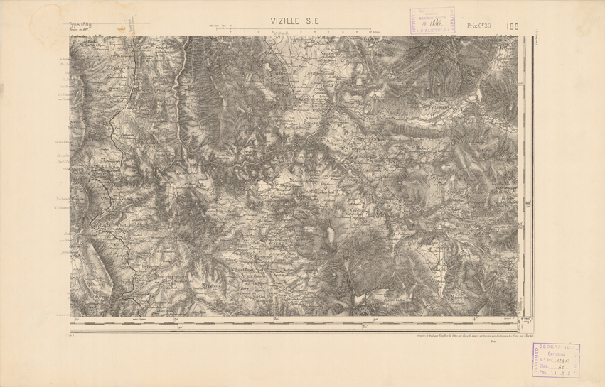 "Paris. Service Géographique de l'Armée, 1889. Ebbe origine dall'Edizione zincografica in quarti di foglio, stabilita dal 1879, per la carta detta de "L'Etat-Major". Infatti non rispondono più il sistema della riproduzione zincografica alle esigenze che la revisione dei fogli imponeva, per un inevitabile logoramento dei rami originali, fu proposta dapprima la correzione degli zinchi, ma questo, importando un lavoro lungo e gravoso, si adottò il procedimento galvanico. I rami galvanici ottenuti e corretti secondo questo sistema presero il nome di "édition type 1889". Allo scopo di facilitare l'incisione fu adoperata la suddivisione in quarti di foglio come per l'edizione zincografica. La revisione dei fogli di questo tipo non fu iniziata che nel 1893. Dal catalogo del S.G.A. risultano mancanti a questa edizione i dipartimenti della "Moselle", del "Bas-Rhin" e del "Haut-Rhin" per i quali non esiste che una edizione in fogli interi aggiornata nel 1901."