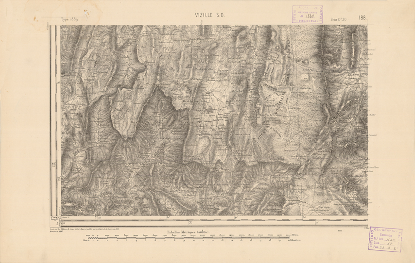 "Paris. Service Géographique de l'Armée, 1889. Ebbe origine dall'Edizione zincografica in quarti di foglio, stabilita dal 1879, per la carta detta de "L'Etat-Major". Infatti non rispondono più il sistema della riproduzione zincografica alle esigenze che la revisione dei fogli imponeva, per un inevitabile logoramento dei rami originali, fu proposta dapprima la correzione degli zinchi, ma questo, importando un lavoro lungo e gravoso, si adottò il procedimento galvanico. I rami galvanici ottenuti e corretti secondo questo sistema presero il nome di "édition type 1889". Allo scopo di facilitare l'incisione fu adoperata la suddivisione in quarti di foglio come per l'edizione zincografica. La revisione dei fogli di questo tipo non fu iniziata che nel 1893. Dal catalogo del S.G.A. risultano mancanti a questa edizione i dipartimenti della "Moselle", del "Bas-Rhin" e del "Haut-Rhin" per i quali non esiste che una edizione in fogli interi aggiornata nel 1901."