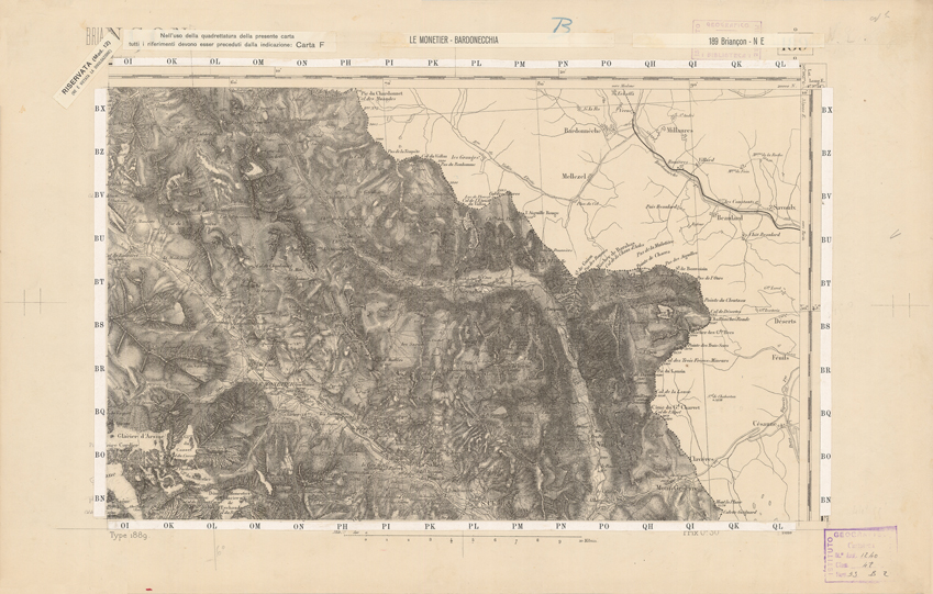 "Paris. Service Géographique de l'Armée, 1889. Ebbe origine dall'Edizione zincografica in quarti di foglio, stabilita dal 1879, per la carta detta de "L'Etat-Major". Infatti non rispondono più il sistema della riproduzione zincografica alle esigenze che la revisione dei fogli imponeva, per un inevitabile logoramento dei rami originali, fu proposta dapprima la correzione degli zinchi, ma questo, importando un lavoro lungo e gravoso, si adottò il procedimento galvanico. I rami galvanici ottenuti e corretti secondo questo sistema presero il nome di "édition type 1889". Allo scopo di facilitare l'incisione fu adoperata la suddivisione in quarti di foglio come per l'edizione zincografica. La revisione dei fogli di questo tipo non fu iniziata che nel 1893. Dal catalogo del S.G.A. risultano mancanti a questa edizione i dipartimenti della "Moselle", del "Bas-Rhin" e del "Haut-Rhin" per i quali non esiste che una edizione in fogli interi aggiornata nel 1901."