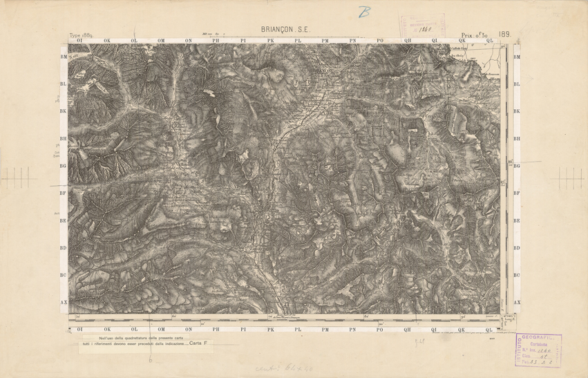 "Paris. Service Géographique de l'Armée, 1889. Ebbe origine dall'Edizione zincografica in quarti di foglio, stabilita dal 1879, per la carta detta de "L'Etat-Major". Infatti non rispondono più il sistema della riproduzione zincografica alle esigenze che la revisione dei fogli imponeva, per un inevitabile logoramento dei rami originali, fu proposta dapprima la correzione degli zinchi, ma questo, importando un lavoro lungo e gravoso, si adottò il procedimento galvanico. I rami galvanici ottenuti e corretti secondo questo sistema presero il nome di "édition type 1889". Allo scopo di facilitare l'incisione fu adoperata la suddivisione in quarti di foglio come per l'edizione zincografica. La revisione dei fogli di questo tipo non fu iniziata che nel 1893. Dal catalogo del S.G.A. risultano mancanti a questa edizione i dipartimenti della "Moselle", del "Bas-Rhin" e del "Haut-Rhin" per i quali non esiste che una edizione in fogli interi aggiornata nel 1901."