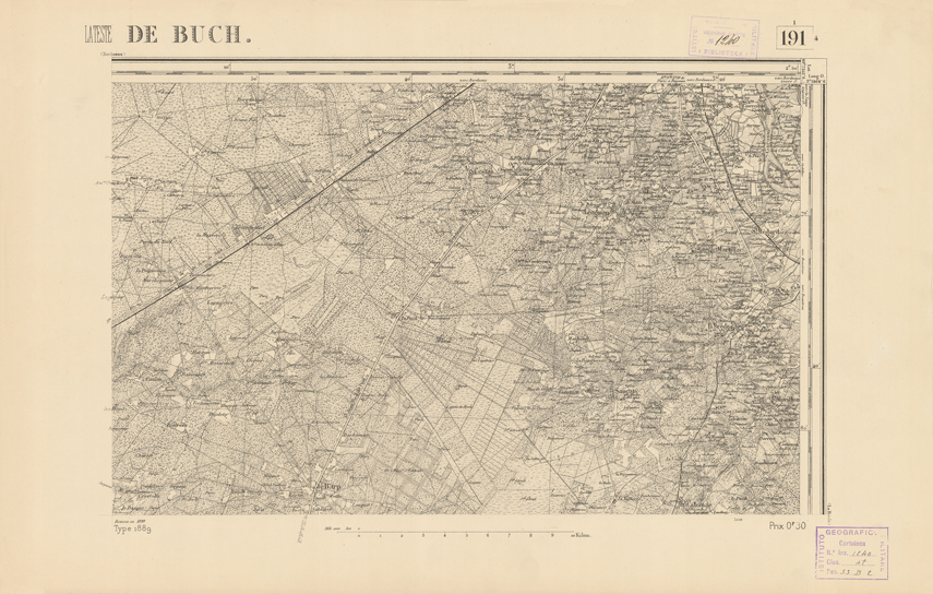 "Paris. Service Géographique de l'Armée, 1889. Ebbe origine dall'Edizione zincografica in quarti di foglio, stabilita dal 1879, per la carta detta de "L'Etat-Major". Infatti non rispondono più il sistema della riproduzione zincografica alle esigenze che la revisione dei fogli imponeva, per un inevitabile logoramento dei rami originali, fu proposta dapprima la correzione degli zinchi, ma questo, importando un lavoro lungo e gravoso, si adottò il procedimento galvanico. I rami galvanici ottenuti e corretti secondo questo sistema presero il nome di "édition type 1889". Allo scopo di facilitare l'incisione fu adoperata la suddivisione in quarti di foglio come per l'edizione zincografica. La revisione dei fogli di questo tipo non fu iniziata che nel 1893. Dal catalogo del S.G.A. risultano mancanti a questa edizione i dipartimenti della "Moselle", del "Bas-Rhin" e del "Haut-Rhin" per i quali non esiste che una edizione in fogli interi aggiornata nel 1901."