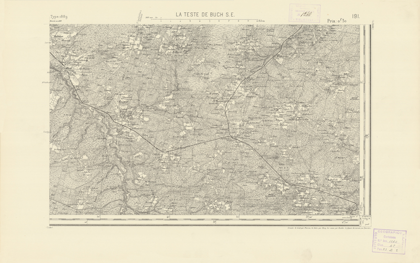 "Paris. Service Géographique de l'Armée, 1889. Ebbe origine dall'Edizione zincografica in quarti di foglio, stabilita dal 1879, per la carta detta de "L'Etat-Major". Infatti non rispondono più il sistema della riproduzione zincografica alle esigenze che la revisione dei fogli imponeva, per un inevitabile logoramento dei rami originali, fu proposta dapprima la correzione degli zinchi, ma questo, importando un lavoro lungo e gravoso, si adottò il procedimento galvanico. I rami galvanici ottenuti e corretti secondo questo sistema presero il nome di "édition type 1889". Allo scopo di facilitare l'incisione fu adoperata la suddivisione in quarti di foglio come per l'edizione zincografica. La revisione dei fogli di questo tipo non fu iniziata che nel 1893. Dal catalogo del S.G.A. risultano mancanti a questa edizione i dipartimenti della "Moselle", del "Bas-Rhin" e del "Haut-Rhin" per i quali non esiste che una edizione in fogli interi aggiornata nel 1901."