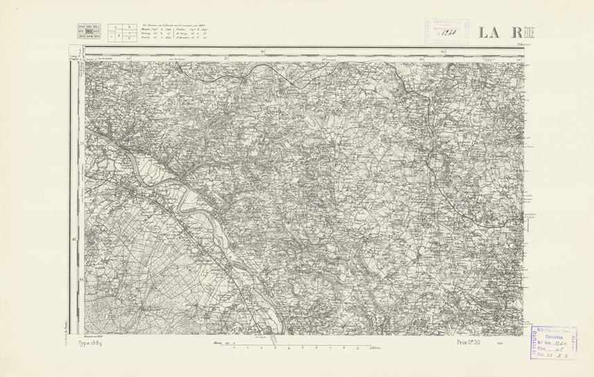 "Paris. Service Géographique de l'Armée, 1889. Ebbe origine dall'Edizione zincografica in quarti di foglio, stabilita dal 1879, per la carta detta de "L'Etat-Major". Infatti non rispondono più il sistema della riproduzione zincografica alle esigenze che la revisione dei fogli imponeva, per un inevitabile logoramento dei rami originali, fu proposta dapprima la correzione degli zinchi, ma questo, importando un lavoro lungo e gravoso, si adottò il procedimento galvanico. I rami galvanici ottenuti e corretti secondo questo sistema presero il nome di "édition type 1889". Allo scopo di facilitare l'incisione fu adoperata la suddivisione in quarti di foglio come per l'edizione zincografica. La revisione dei fogli di questo tipo non fu iniziata che nel 1893. Dal catalogo del S.G.A. risultano mancanti a questa edizione i dipartimenti della "Moselle", del "Bas-Rhin" e del "Haut-Rhin" per i quali non esiste che una edizione in fogli interi aggiornata nel 1901."