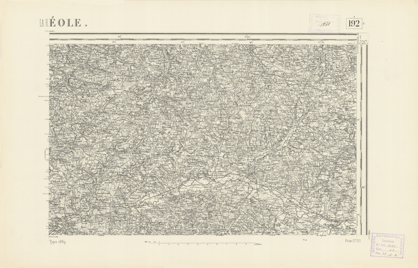 "Paris. Service Géographique de l'Armée, 1889. Ebbe origine dall'Edizione zincografica in quarti di foglio, stabilita dal 1879, per la carta detta de "L'Etat-Major". Infatti non rispondono più il sistema della riproduzione zincografica alle esigenze che la revisione dei fogli imponeva, per un inevitabile logoramento dei rami originali, fu proposta dapprima la correzione degli zinchi, ma questo, importando un lavoro lungo e gravoso, si adottò il procedimento galvanico. I rami galvanici ottenuti e corretti secondo questo sistema presero il nome di "édition type 1889". Allo scopo di facilitare l'incisione fu adoperata la suddivisione in quarti di foglio come per l'edizione zincografica. La revisione dei fogli di questo tipo non fu iniziata che nel 1893. Dal catalogo del S.G.A. risultano mancanti a questa edizione i dipartimenti della "Moselle", del "Bas-Rhin" e del "Haut-Rhin" per i quali non esiste che una edizione in fogli interi aggiornata nel 1901."