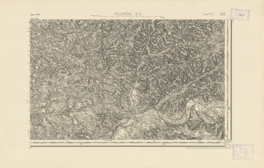 "Paris. Service Géographique de l'Armée, 1889. Ebbe origine dall'Edizione zincografica in quarti di foglio, stabilita dal 1879, per la carta detta de "L'Etat-Major". Infatti non rispondono più il sistema della riproduzione zincografica alle esigenze che la revisione dei fogli imponeva, per un inevitabile logoramento dei rami originali, fu proposta dapprima la correzione degli zinchi, ma questo, importando un lavoro lungo e gravoso, si adottò il procedimento galvanico. I rami galvanici ottenuti e corretti secondo questo sistema presero il nome di "édition type 1889". Allo scopo di facilitare l'incisione fu adoperata la suddivisione in quarti di foglio come per l'edizione zincografica. La revisione dei fogli di questo tipo non fu iniziata che nel 1893. Dal catalogo del S.G.A. risultano mancanti a questa edizione i dipartimenti della "Moselle", del "Bas-Rhin" e del "Haut-Rhin" per i quali non esiste che una edizione in fogli interi aggiornata nel 1901."