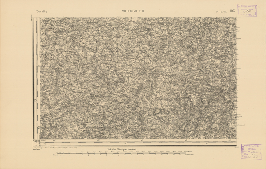 "Paris. Service Géographique de l'Armée, 1889. Ebbe origine dall'Edizione zincografica in quarti di foglio, stabilita dal 1879, per la carta detta de "L'Etat-Major". Infatti non rispondono più il sistema della riproduzione zincografica alle esigenze che la revisione dei fogli imponeva, per un inevitabile logoramento dei rami originali, fu proposta dapprima la correzione degli zinchi, ma questo, importando un lavoro lungo e gravoso, si adottò il procedimento galvanico. I rami galvanici ottenuti e corretti secondo questo sistema presero il nome di "édition type 1889". Allo scopo di facilitare l'incisione fu adoperata la suddivisione in quarti di foglio come per l'edizione zincografica. La revisione dei fogli di questo tipo non fu iniziata che nel 1893. Dal catalogo del S.G.A. risultano mancanti a questa edizione i dipartimenti della "Moselle", del "Bas-Rhin" e del "Haut-Rhin" per i quali non esiste che una edizione in fogli interi aggiornata nel 1901."