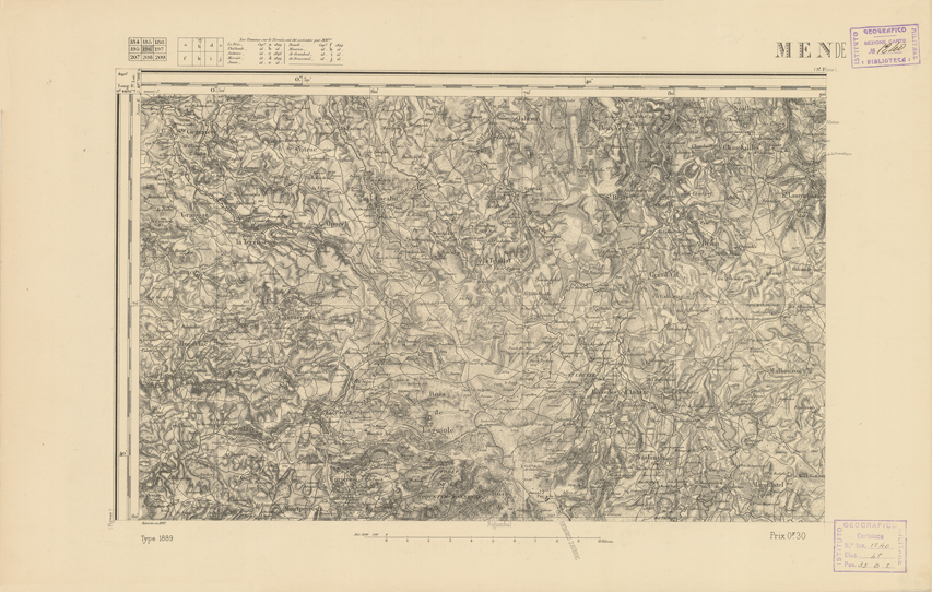 "Paris. Service Géographique de l'Armée, 1889. Ebbe origine dall'Edizione zincografica in quarti di foglio, stabilita dal 1879, per la carta detta de "L'Etat-Major". Infatti non rispondono più il sistema della riproduzione zincografica alle esigenze che la revisione dei fogli imponeva, per un inevitabile logoramento dei rami originali, fu proposta dapprima la correzione degli zinchi, ma questo, importando un lavoro lungo e gravoso, si adottò il procedimento galvanico. I rami galvanici ottenuti e corretti secondo questo sistema presero il nome di "édition type 1889". Allo scopo di facilitare l'incisione fu adoperata la suddivisione in quarti di foglio come per l'edizione zincografica. La revisione dei fogli di questo tipo non fu iniziata che nel 1893. Dal catalogo del S.G.A. risultano mancanti a questa edizione i dipartimenti della "Moselle", del "Bas-Rhin" e del "Haut-Rhin" per i quali non esiste che una edizione in fogli interi aggiornata nel 1901."