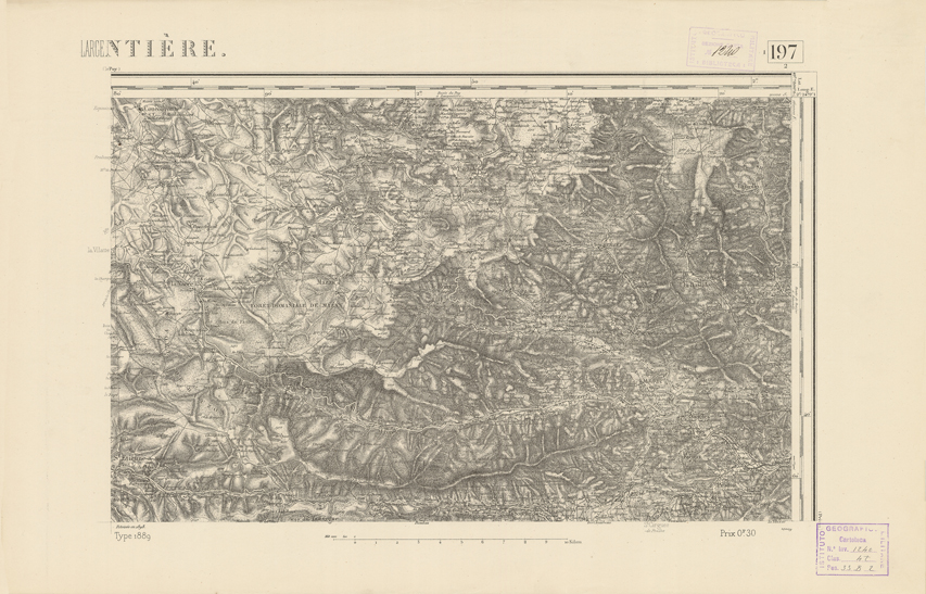 "Paris. Service Géographique de l'Armée, 1889. Ebbe origine dall'Edizione zincografica in quarti di foglio, stabilita dal 1879, per la carta detta de "L'Etat-Major". Infatti non rispondono più il sistema della riproduzione zincografica alle esigenze che la revisione dei fogli imponeva, per un inevitabile logoramento dei rami originali, fu proposta dapprima la correzione degli zinchi, ma questo, importando un lavoro lungo e gravoso, si adottò il procedimento galvanico. I rami galvanici ottenuti e corretti secondo questo sistema presero il nome di "édition type 1889". Allo scopo di facilitare l'incisione fu adoperata la suddivisione in quarti di foglio come per l'edizione zincografica. La revisione dei fogli di questo tipo non fu iniziata che nel 1893. Dal catalogo del S.G.A. risultano mancanti a questa edizione i dipartimenti della "Moselle", del "Bas-Rhin" e del "Haut-Rhin" per i quali non esiste che una edizione in fogli interi aggiornata nel 1901."