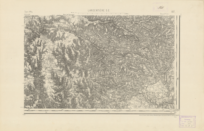 "Paris. Service Géographique de l'Armée, 1889. Ebbe origine dall'Edizione zincografica in quarti di foglio, stabilita dal 1879, per la carta detta de "L'Etat-Major". Infatti non rispondono più il sistema della riproduzione zincografica alle esigenze che la revisione dei fogli imponeva, per un inevitabile logoramento dei rami originali, fu proposta dapprima la correzione degli zinchi, ma questo, importando un lavoro lungo e gravoso, si adottò il procedimento galvanico. I rami galvanici ottenuti e corretti secondo questo sistema presero il nome di "édition type 1889". Allo scopo di facilitare l'incisione fu adoperata la suddivisione in quarti di foglio come per l'edizione zincografica. La revisione dei fogli di questo tipo non fu iniziata che nel 1893. Dal catalogo del S.G.A. risultano mancanti a questa edizione i dipartimenti della "Moselle", del "Bas-Rhin" e del "Haut-Rhin" per i quali non esiste che una edizione in fogli interi aggiornata nel 1901."