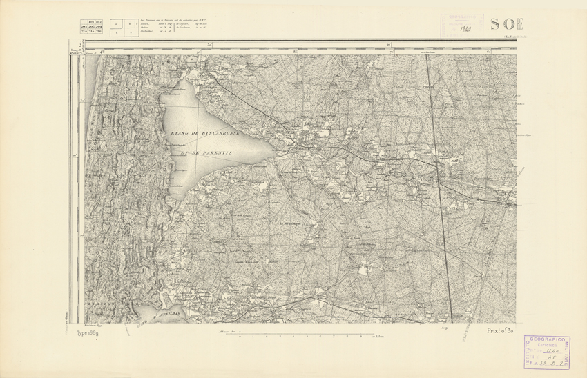 "Paris. Service Géographique de l'Armée, 1889. Ebbe origine dall'Edizione zincografica in quarti di foglio, stabilita dal 1879, per la carta detta de "L'Etat-Major". Infatti non rispondono più il sistema della riproduzione zincografica alle esigenze che la revisione dei fogli imponeva, per un inevitabile logoramento dei rami originali, fu proposta dapprima la correzione degli zinchi, ma questo, importando un lavoro lungo e gravoso, si adottò il procedimento galvanico. I rami galvanici ottenuti e corretti secondo questo sistema presero il nome di "édition type 1889". Allo scopo di facilitare l'incisione fu adoperata la suddivisione in quarti di foglio come per l'edizione zincografica. La revisione dei fogli di questo tipo non fu iniziata che nel 1893. Dal catalogo del S.G.A. risultano mancanti a questa edizione i dipartimenti della "Moselle", del "Bas-Rhin" e del "Haut-Rhin" per i quali non esiste che una edizione in fogli interi aggiornata nel 1901."